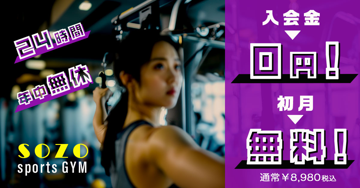 24時間年中無休、初月無料を強調したジムのプロモーションバナー(架空)